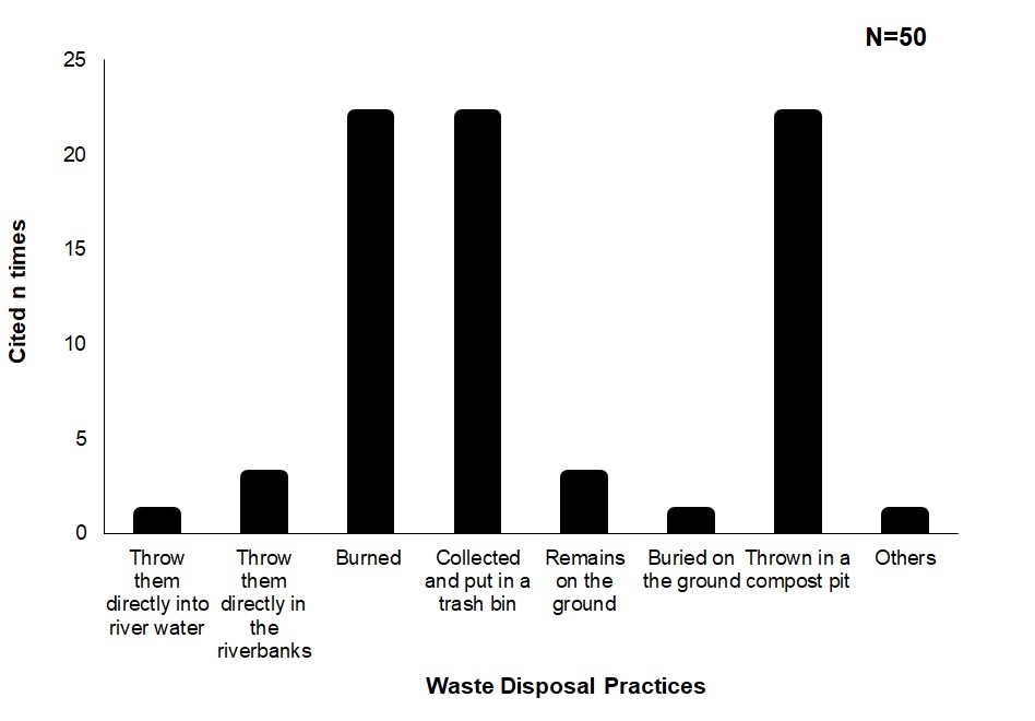 Waste disposal practices of the locals. The y axis indicates the number of times a practice was cited. Respondents were allowed to choose more than one answer. N = number of respondents.