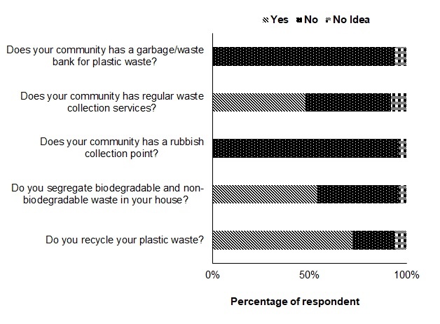 When asked if the community has a garbage waste bank for plastic waste, 94% of the respondents answered there is ‘no’ (n=47) waste bank for plastic waste in the community, while 6% have no idea (n=3) (Figure 5). 48% of the respondents said that the community has regular waste collection services (n=24), 44% said that there are no regular waste collection services (n=22), while 8% have no idea (n=4). Majority of the respondents said there is no rubbish collection point in the area (n=48, 96%), while 4% have no idea (n=2). 72% of the respondents were recycling plastic waste (n=36), while 22% do not perform recycling, and 6% of the respondents have no idea about recycling. 54% of the respondents practice segregation of biodegradable and non-biodegradable materials, while 42% do not practice it (n=21), only 4% have no idea about segregation (n=2).