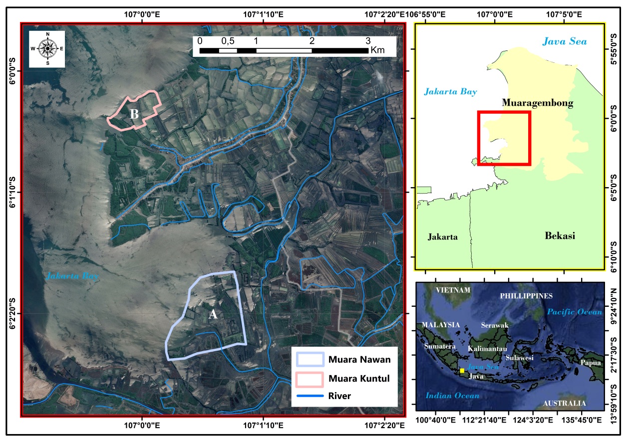Muaragembong sub-district is geographically located between 106°58’ and 107°7’ East and 5°55’ and 6°5’ South. Jakarta Bay borders it to the west, the Java Sea to the north, Karawang Regency to the east, and Babelan Regency to the south (Figure 1). The study was conducted in two locations there is Muara Nawan (coordinates: 6°02’21.29” S, 107°00’36.87” E) and Muara Kuntul (coordinates: 6°00’23.00” S, 106°59’55.43” E). Both estuaries are part of the downstream runoff and flow distribution from the Citarum River.