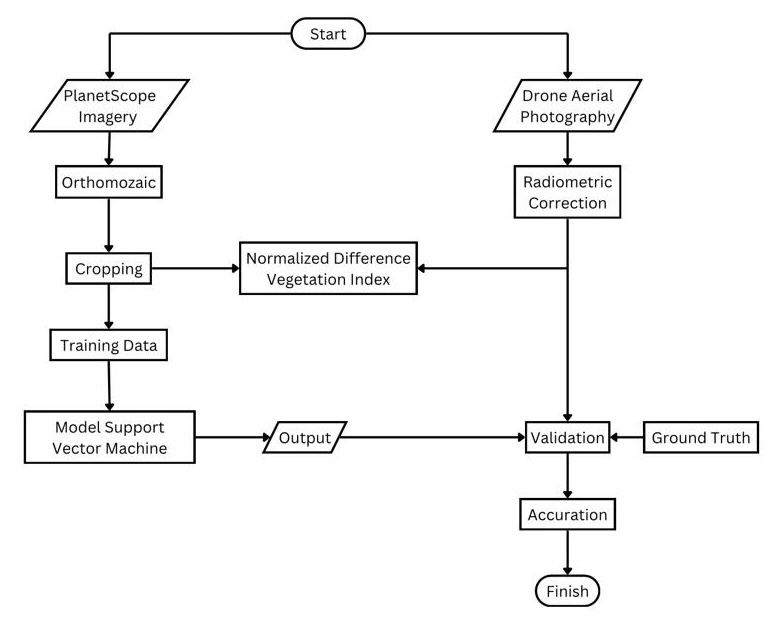 Analyzing mangrove community dynamic changes in this study was conducted by combining satellite imagery with aerial photogrammetry. Planetscope satellite images were processed to obtain a complete mosaic, followed by cropping to match the study area. Next, NDVI calculation to identify vegetation greenness levels, which play a role in distinguishing mangrove based on their spectral responses. Training data were generated from the composite band imagery to serve as input for the mangrove species classification process using the SVM method. The SVM model produced a classified mangrove communities map, which was validated to test the accuracy of the classification model. The final stage of this process is evaluating accuracy and compiling results to illustrate the dynamics of changes in the mangrove community in Muara Nawan and Muara Kuntul.