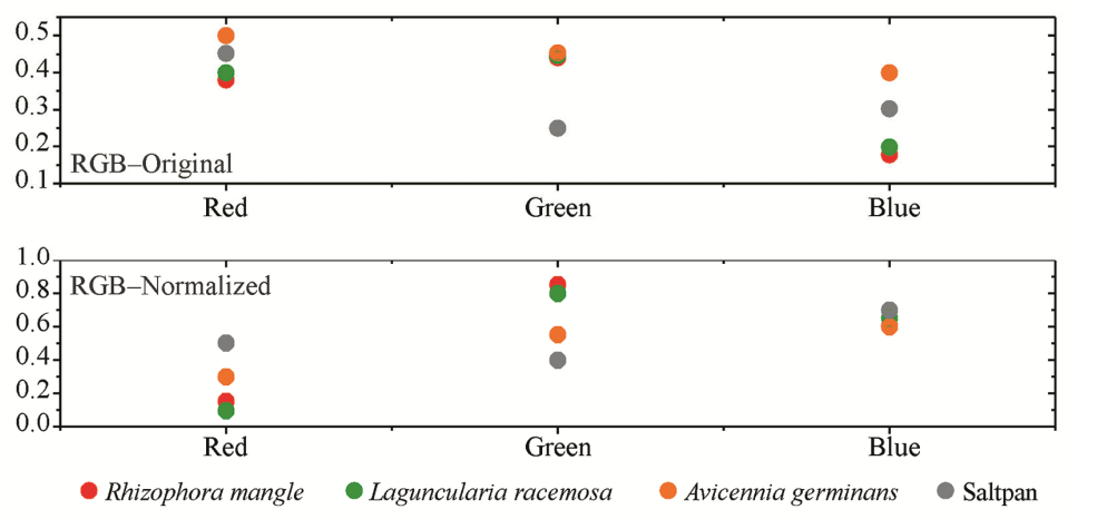 Drone data offers higher spatial resolution than commercial satellite imagery, which has great potential for identifying existing mangrove types. The spectral responses of mangroves can be comprehensively measured across a specific range of the electromagnetic radiation spectrum using sensors such as RGB cameras. There are differences in their spectral responses when identifying between different types of mangroves (Lisein et al., 2015). In the original RGB imagery, the yellow circle representing Avicennia sp. is positioned higher than the red circle representing Rhizophora sp. (Fig 3).