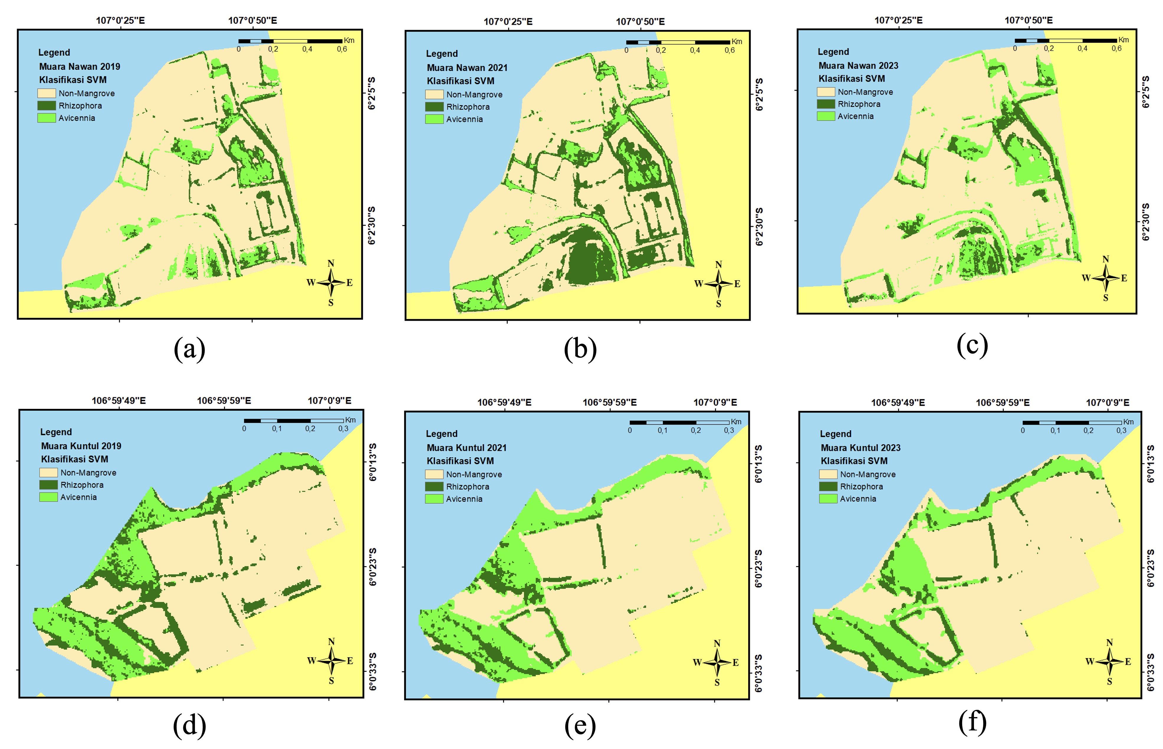 The coastal area of Muaragembong has a predominantly sandy mud substrate, with daily tides only occurring once per day. These two factors influence the zonation dynamics of the mangrove ecosystem (Suryadi et al., 2021). The classification results showed that two types of mangroves, Avicennia sp. and Rhizophora sp., were detected in Muara Nawan and Muara Kuntul, which grow on muddy substrates. The classification utilized three land cover classes: non-mangrove (land, aquaculture ponds, and settlements), Avicennia sp., and Rhizophora sp.. To differentiate between the two genera, Avicennia sp. is marked with light green, while Rhizophora sp. is marked with dark green. The classification was carried out using the SVM algorithm (Fig 4).