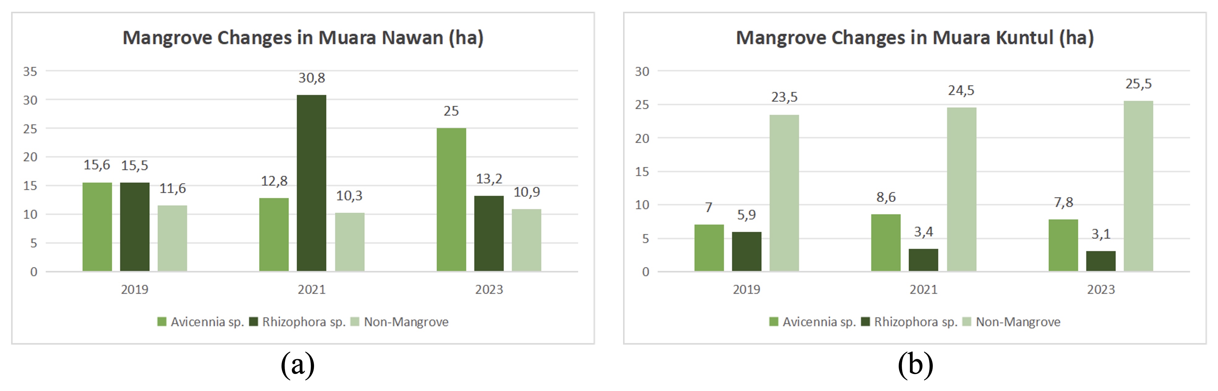 In 2021, there was a significant increase in the population of Rhizophora sp. mangroves, particularly in Muara Nawan (Fig 5A). There was massive planting in 2019, which is why there is an increase in the mangrove population in 2021; mangrove growth takes quite a long time. A similar trend was observed with the increase in Avicennia sp. populations in 2023, resulting from planting activities in 2022. In contrast, Muara Kuntul experienced a significant decrease in mangrove coverage, resulting in an expansion in non-mangrove areas. This is related to the occupation of the local community, which is predominantly fisherman and aquaculture. This land reduction is due to converting mangrove areas into ponds, with the required area reaching 200–2,000 (Wulandari et al., 2024). In Muaragembong, Rhizophora sp. species are widely utilized for natural dyes for batik fabrics. Consequently, visible mangrove degradation is in a small area (Fig 5B). Although the local community still maintain their cultural ties by referring to mangroves local terms such as ‘bakau-bakau’ for Rhizophora sp. and ‘api-api’ for Avicennia sp. (Indarjani & Wibowo et al., 2021), this cultural heritage is at risk of gradual loss if mangrove cover continues to decline due to overexploitation, land-used conversion, and external pressure.