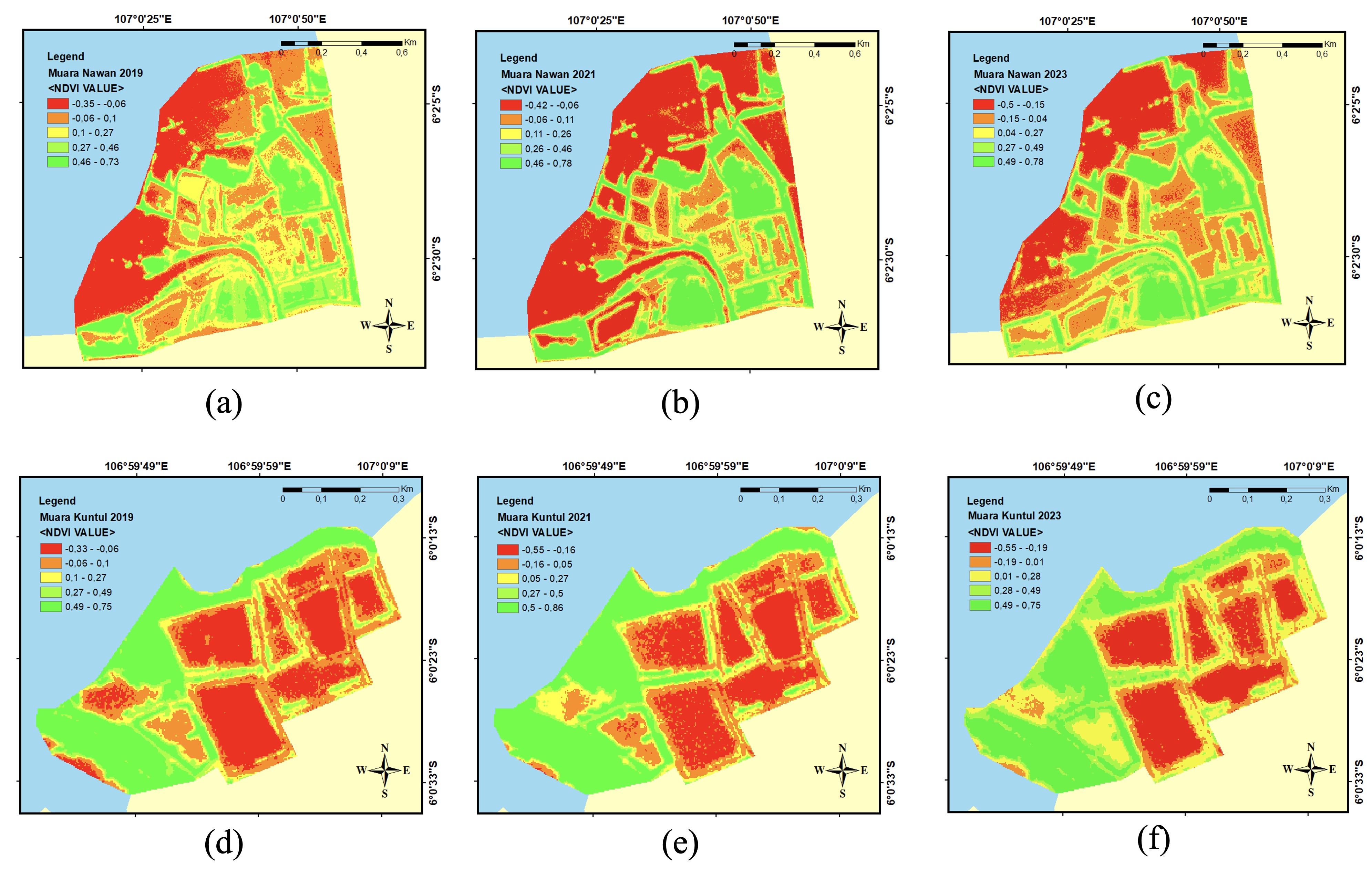 Overall, NDVI can analyze the density and health of mangrove areas. Fertile soil is a key indicator of healthy mangrove presence because it provides abundant nutrients that support optimal mangrove growth (Azzahra et al., 2025). The NDVI values produced from the two estuaries fall into the moderate to high category with values of 0.3–0.8 (Fig 6). Muara Nawan has shown a steady annual increase in mangrove density, in contrast to Muara Kuntul, which experienced significant fluctuations between 2021 and 2023. The lowest density was obtained in 2019 because mangrove planting was massive 2019 and takes time to grow. In 2023, there was a decline in mangrove density, particularly in the outermost zone facing the open sea (Fig 6F). This reduction may happen because it is influenced by the movement of tidal currents with the amount of rubbish carried from the sea, which can inhibit the growth of existing mangrove vegetation (Hanan et al., 2020). Additionally, the northern coast of Java is affected by monsoonal patterns and is frequently subjected to tidal flooding or seawater intrusion. These factors cause significant geomorphological changes and increase the vulnerability of coastal areas (Persada et al., 2025).