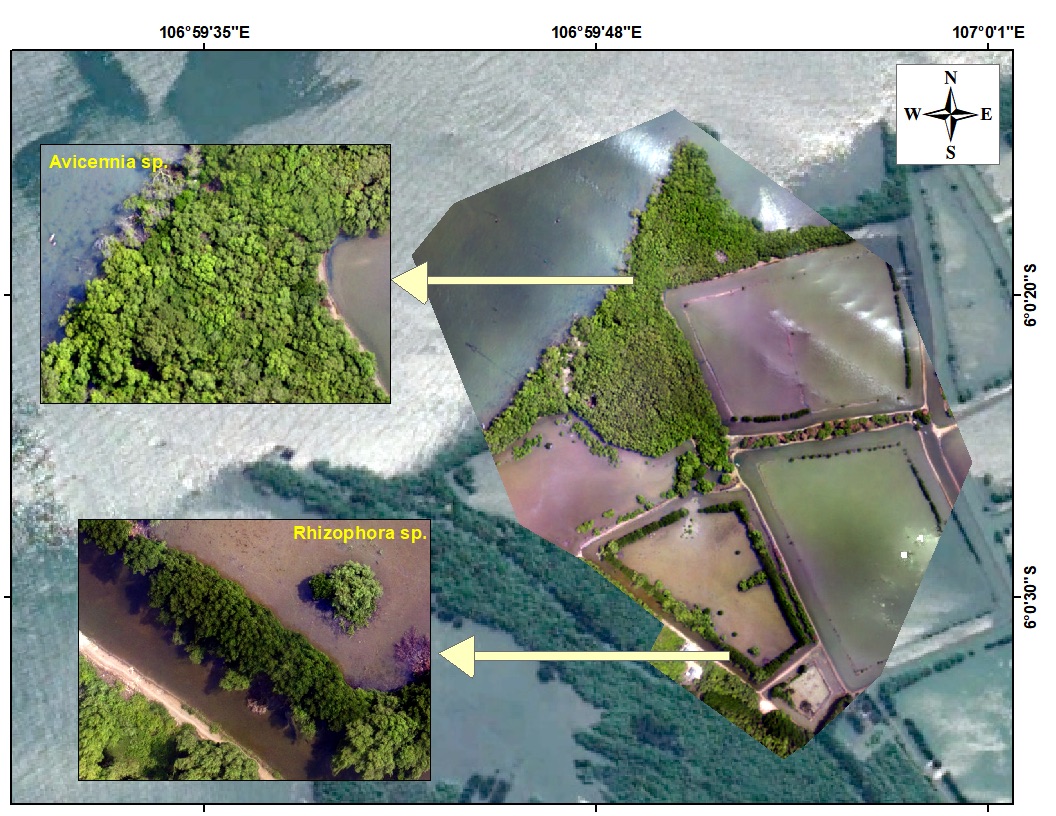 Muaragembong sub-district is a natural reserve area on the northern coast of West Java. Mangrove forests and aquaculture ponds dominate this area. The distribution of the mangrove ecosystem in Muaragembong is mainly dominated by the genera Rhizophora sp. and Avicennia sp. (Rachmawati et al., 2014). The Avicennia sp. genus can grow up to 30 meters high and typically forms dense clusters. They are also equipped with specialized roots known as pneumatophores, which enable plants to obtain oxygen even when growing in waterlogged soils (Cerri et al., 2024). Avicennia sp. is generally used in industry and traditional medicine by communities living near mangrove ecosystems. The wood can be processed for construction materials, while the leaves, fruit, roots, bark, and seeds are traditionally used to treat various ailments (Beniwal et al., 2024). The Rhizophora sp. has 20–30 meters tall. A distinctive characteristic of Rhizophora sp. is the root system that sticks out from the tree trunk and extends along the ground surface. The leaves are thick, with black speckles on their undersides (Malaysia, 2021). Differences in mangrove growth location influenced by various environmental parameters. For example, salinity differences of the genus Avicennia sp. are classified as crypto viviparous mangroves that can grow in high salinity levels (Ye et al., 2005).