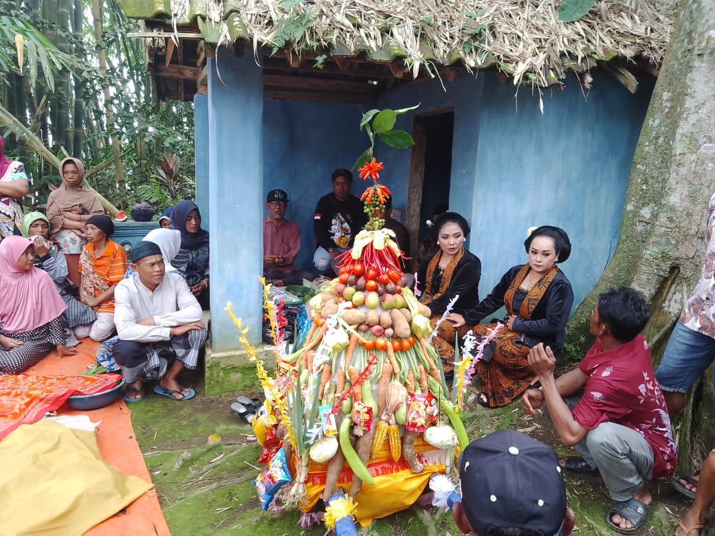 Offerings with Coffee Leaf Tips and Harvests of Taji Village, a Requirement for Bersih Desa, as well as Two Tayub dancers wearing black kebaya blouses, traditional jarik cloth, and brown batik shawls